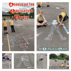 We drew models of the circulatory system on the playground, as you can see on the collage we made. One group made a giant model, which ate Ivo.