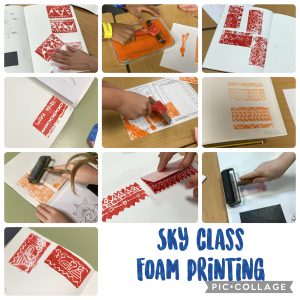 In art we’re doing printing to make our own colourful sunstones by making circles in foam and then rolling ink over the foam, then we put the ink covered foam on a piece of paper to make the perfect print.