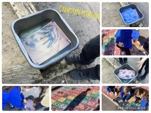 In our English book we are reading a book called The Bluest of Blues which is all about Anna Atkins and her work on cyanotypes to print the natural world. We were really interested to see what happened when you used the sun to create prints of leaves, twigs, flowers and grass. We were each given a sheet of cyanotype paper (which had special chemicals on it) and laid out our collection of leaves etc. on top of the paper. We then left the sheet out in the sunlight for 15-20 minutes. After the time was up, we removed all of the leaves and could see the prints start to appear. We then had to rinse the paper in cold water for the process to be finished. We had varying results as some of did not flatten the leaves enough and some of us forgot to weigh down our leaves so they blew away! We are going to try again soon and hopefully learn from our mistakes.