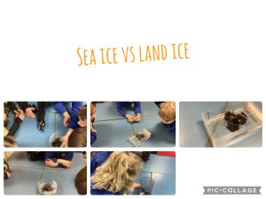 In Geography we have been learning about the impact of climate change. One of the things we looked at is the melting polar caps. We set up an experiment using water, ice cubes, containers and metal weights.
