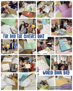 On world book day we made our own books based on the day the crayons quit, we called it the day the clothes quit. It was about our clothes being forgotten and left behind. We wrote about clothes like tops, t-shirts, jeans, socks, shoes and jumpers. We really enjoyed the day writing about the clothes and making the book – it was really fun!
