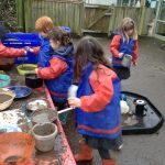 We are all having fun in the mud kitchen this week in our waterproof jackets and wellies – mixing, scooping, pouring, stirring. Fancy a chocolate mud pie anyone?