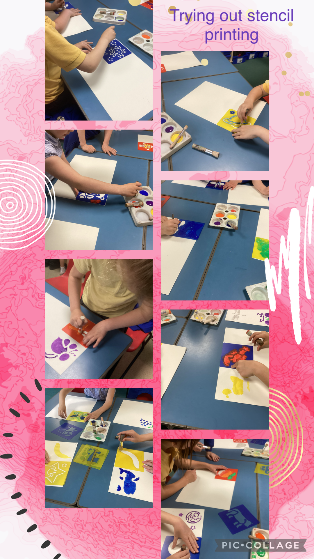 Y3/4 pupils trying out stencil printing in preparation for making their own for protest posters. Inspired by Banksy.